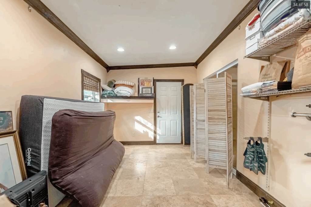 If you can imagine it, this space started as a lanai that had been converted into a bedroom — dark, awkward, and completely disconnected from the rest of the house. It was begging for a purpose that matched its potential. If you look closely, you can see an actual weed growing indoors from the crack where the floor meets the wall. Love that! 🤣